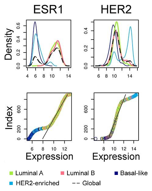 ESR1 and HER2 expression in various breast carcinoma subtypes defined by PAM50 assay (Tishchenko et al., 2016).