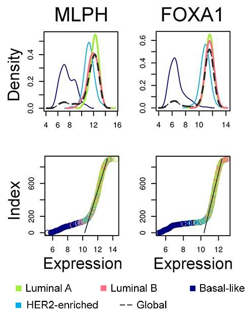 MLPH and FOXA1 expression in various breast carcinoma subtypes defined by PAM50 assay (Tishchenko et al., 2016).